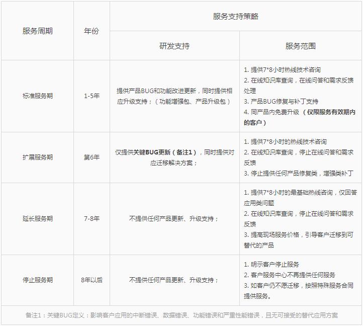 金蝶软件根据产品所处的服务时间的不你同,提供的服务业不同。比如如果是在标准服务时间内,也就是五年之内,那么就可以同产品bug和功能改进更新,同时还能提供相应的升级服务:功能增强包、产品升级包。服务范围7到8个小时的热线技术咨询服务,可以在线知识库查询,在线问答和需求反馈处理!同时产品还能免费升级:具体如下图所示: